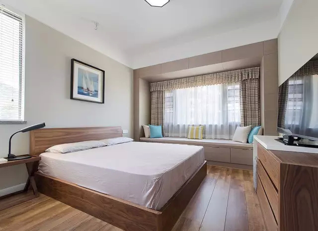 ▲老人房整体配色安静,平和。飘窗部位的梁比较低,仅仅通过饰面板的设计,在视觉上有了舒展,完全打破了压抑的感觉;兼具收纳与休闲功能的榻榻米,增加了休憩、阅读的舒适空间。