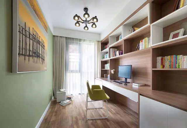 ▲书房大面积浅木色柜体设计,搭配部分白色进行过渡,层次感分明,使书房显得宽敞明亮。薄荷绿的清新,高清晰照片式装饰画,给人清新舒爽的感觉。
