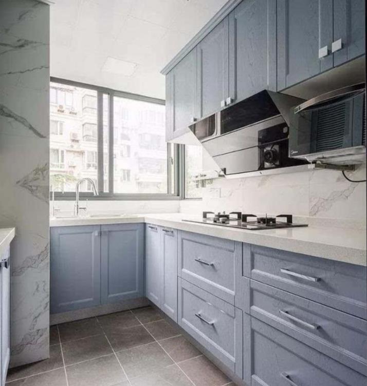 厨房伯爵白的墙砖和灰色磨砂灰色地砖很上档次,蓝色的L型橱柜清新自然,让整个空间充满了活力,操作台空间很大,满足厨房做饭需求.