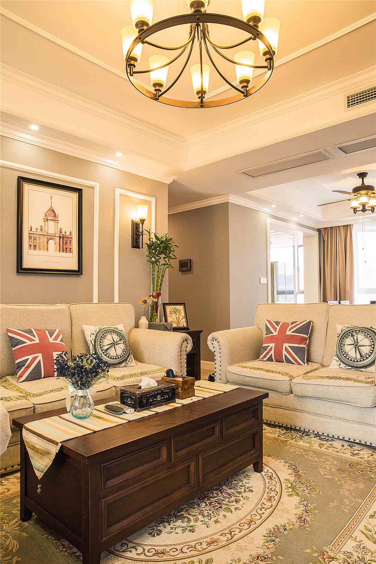 表嫂在地面都有摆放地毯,和玄关一样,特别精致,搭配麻色的美式布艺沙发,挺时尚小资的。