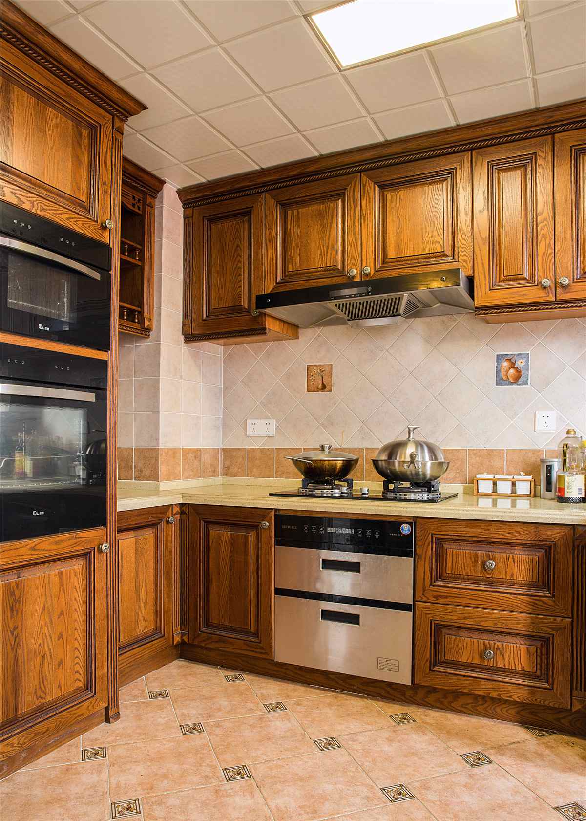厨房看起来像中老年人喜欢的那种,虽然说比较符合美式风格,但是还是过于稳重了一些,相比较年轻人,应该都偏爱清新的浅色系吧?