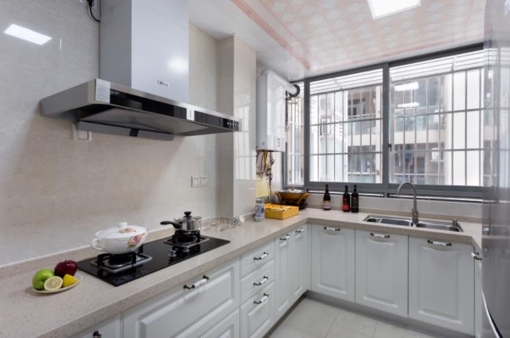 厨房U型橱柜收纳性能特别强,白色橱柜和浅米色墙地砖搭配大气上档次。
