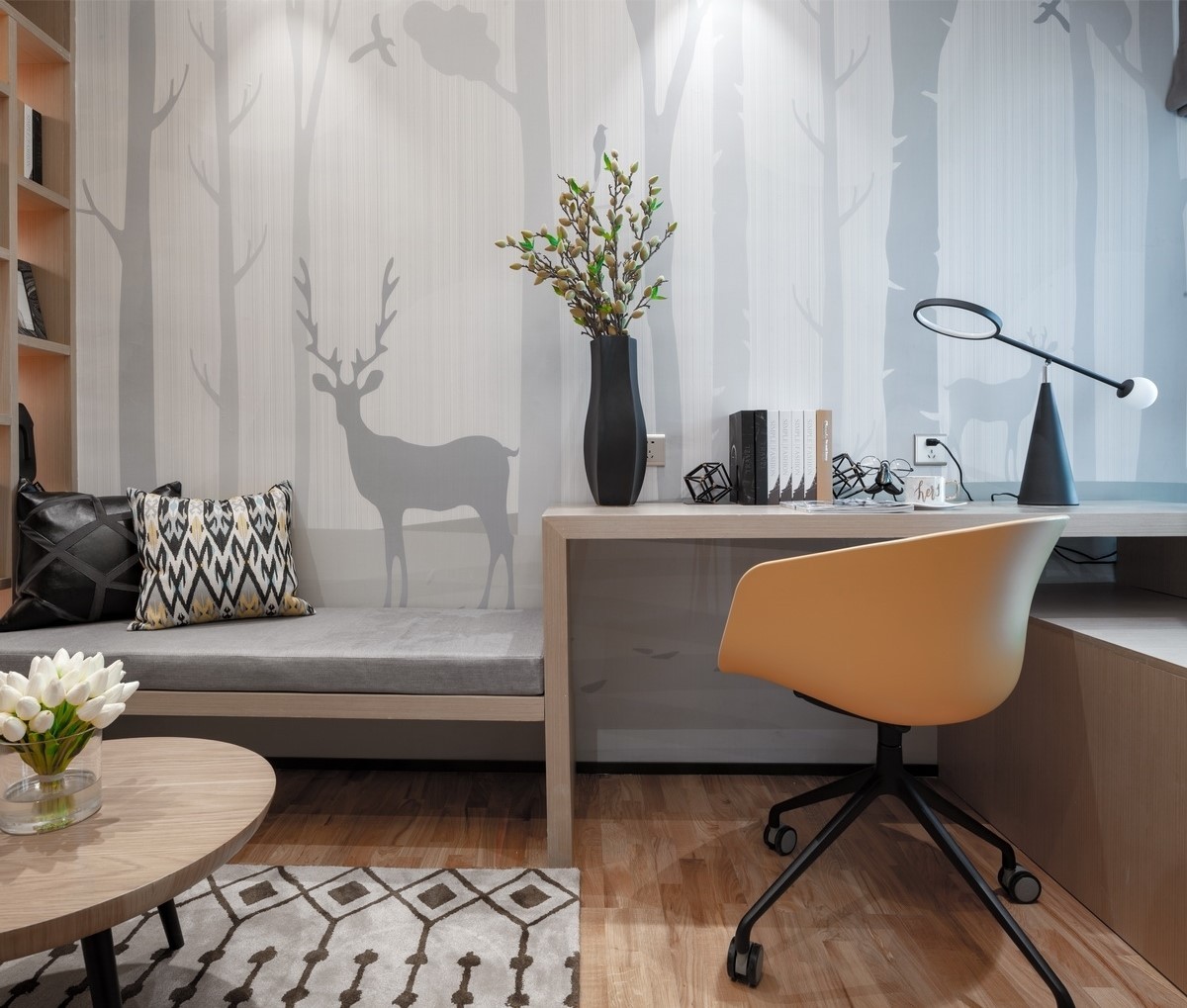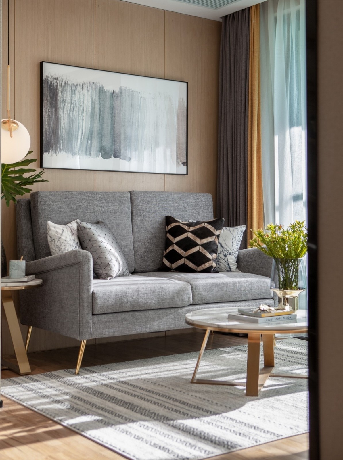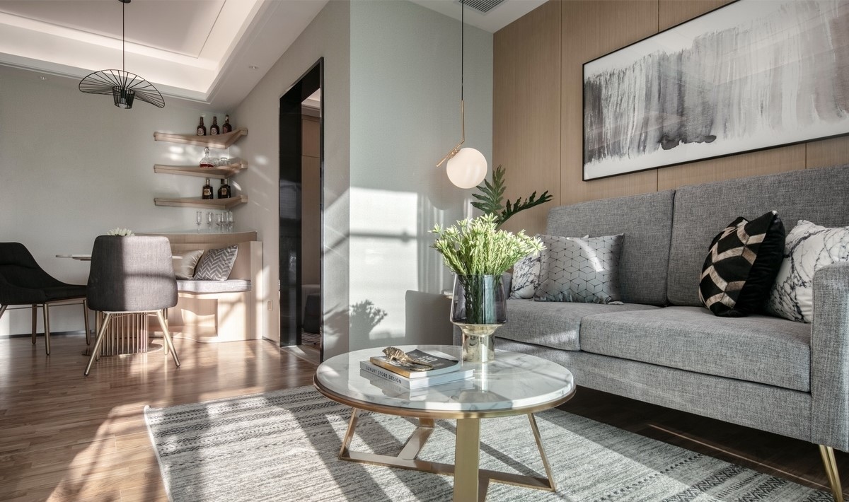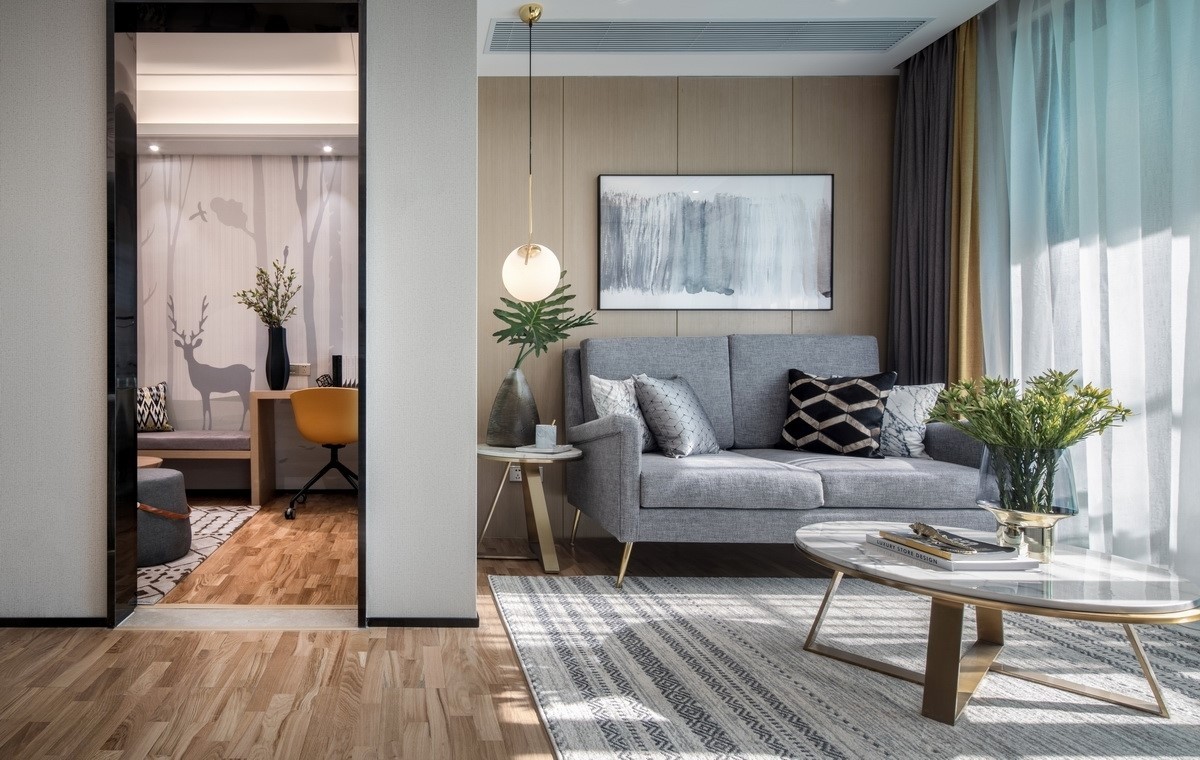 里面的装饰并没有过于艳丽的颜色,沙发背景墙也是木饰面板装饰,搭配灰色的沙发和地毯,氛围就柔和很多。