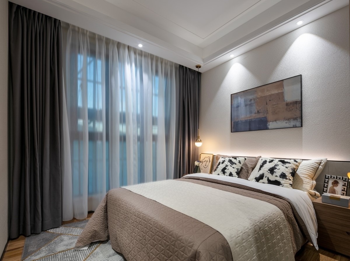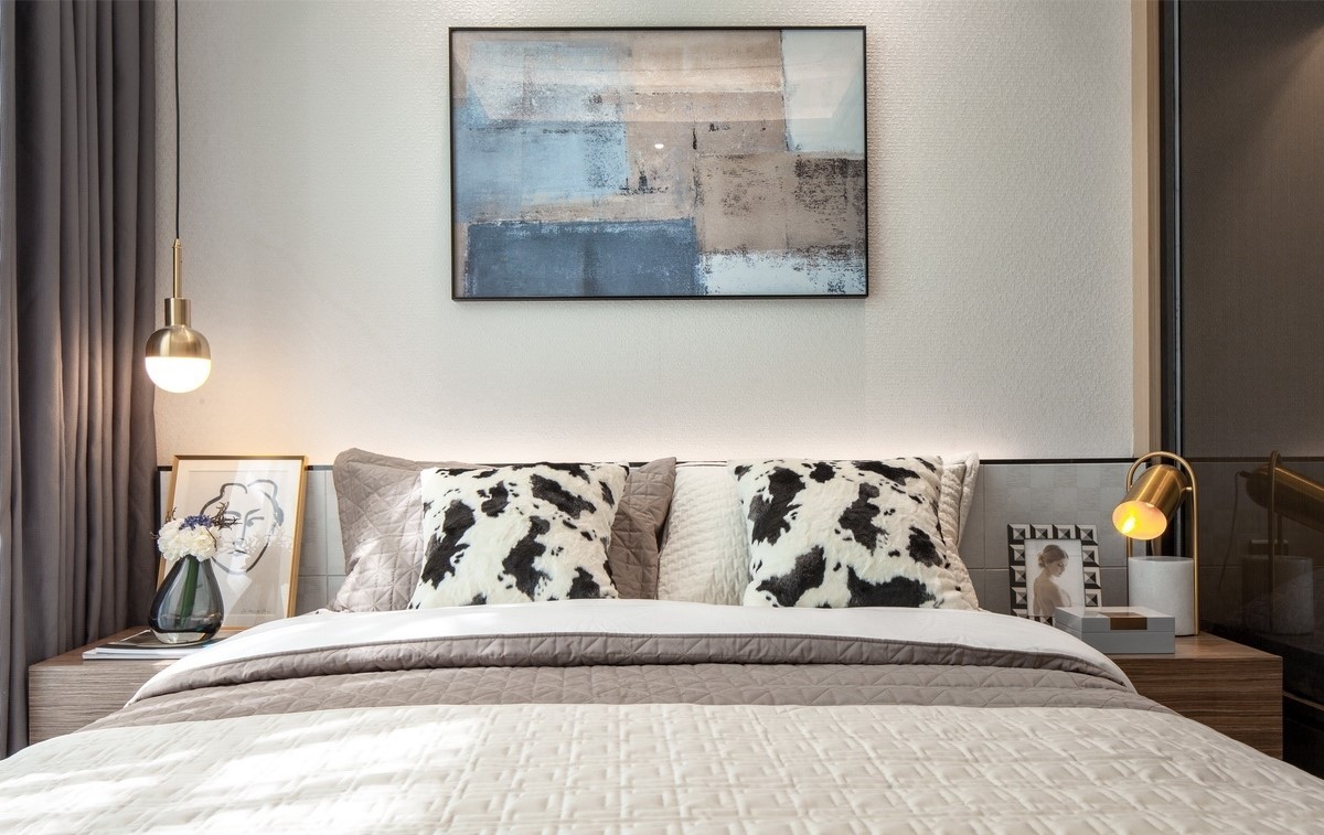 床头暗藏的灯带设计为空间增添温馨的感觉,与旁边的简约吊灯相辅相成,让人享受一场宁静的酣眠