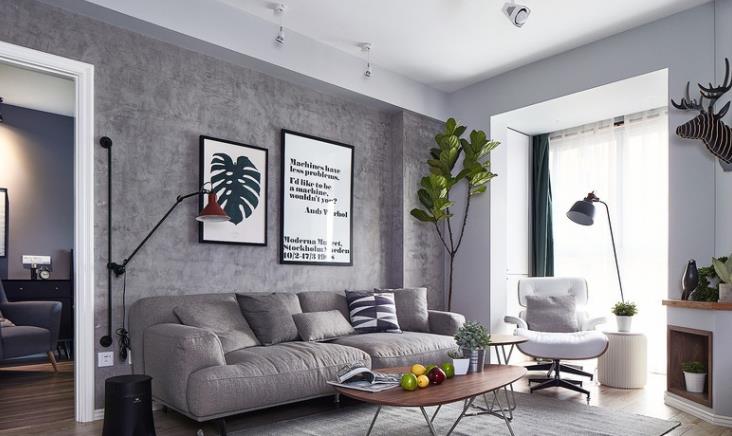 和水泥颜色一样,符合了业主一开始的定位,轻工业风,家居很有质感,也要有一些木质元素的融入,不然会有一些冰冷,顶面用了白色,层高比较高,地板选择了美国橡木,融合现代元素。